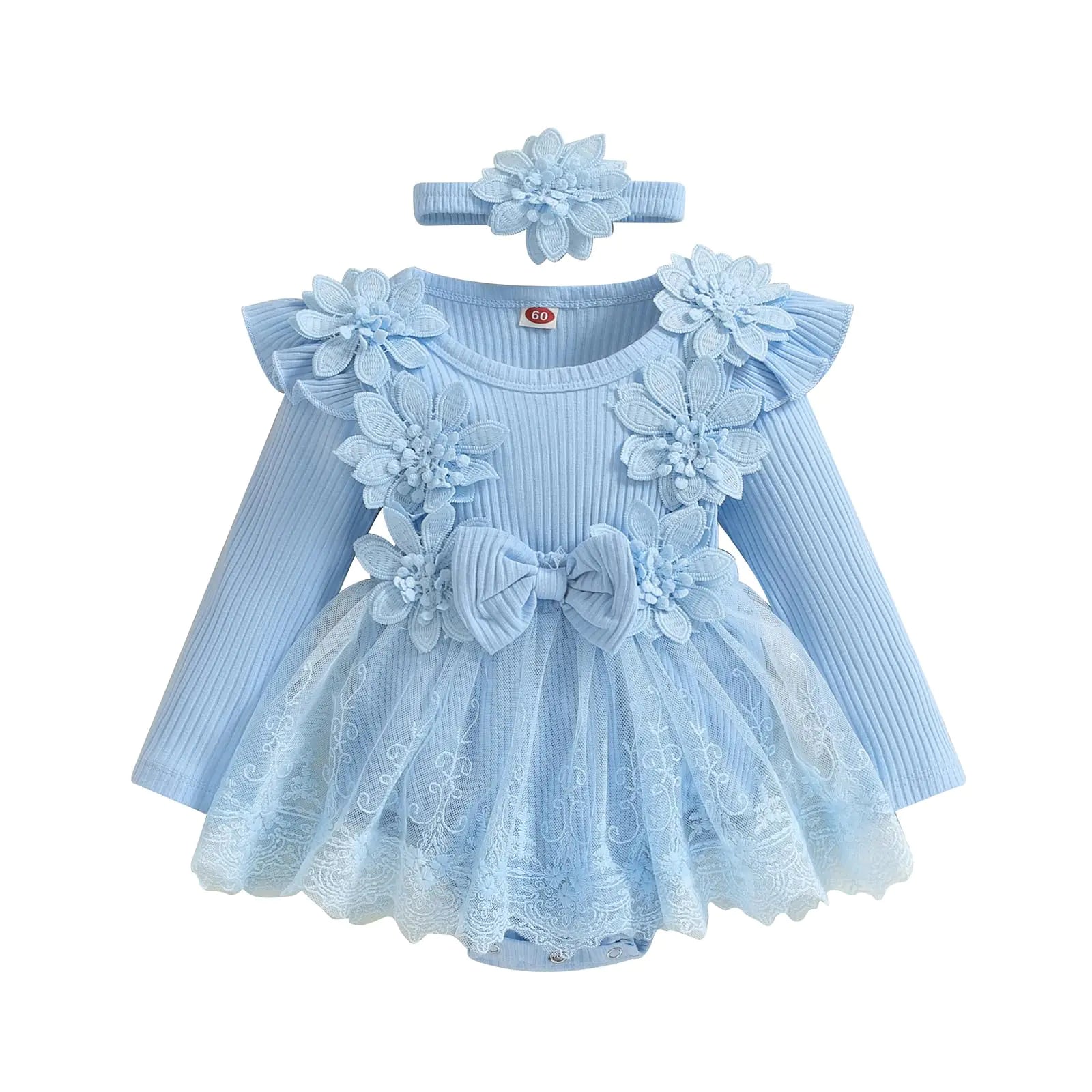 Design: Baby girl romper dress with a waist big bow, flared mesh skirt, round neck, long sleeve shoulder ruffled trim delicate lace floral pattern at the hem and 3D flowers trim at the front makes kids looks lively and eye-catching.